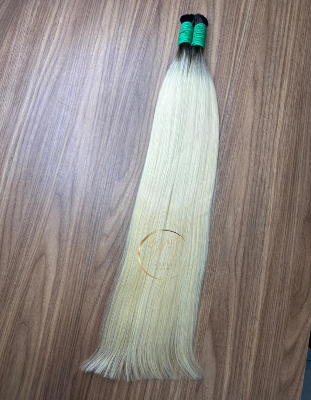 O cabelo loiro vietnamita é um cabelo descolorido, de toque muito suave e um cabelo muito saudável. Este cabelo possui ondulações naturais após lavado, ele não é liso, é apenas descolorido. Apesar de ser semi limpo é um cabelo com poucos fios curtos, com pontas bem preenchidas e bonitas (Não possui pontas cheias). Possui a raiz mais escura esfumada, dando aproximadamente um palmo esfumado.